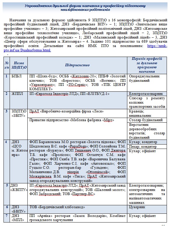 про результати впровадження дуальної форми навчання у закладах професійної (професійно-технічної) освіти області